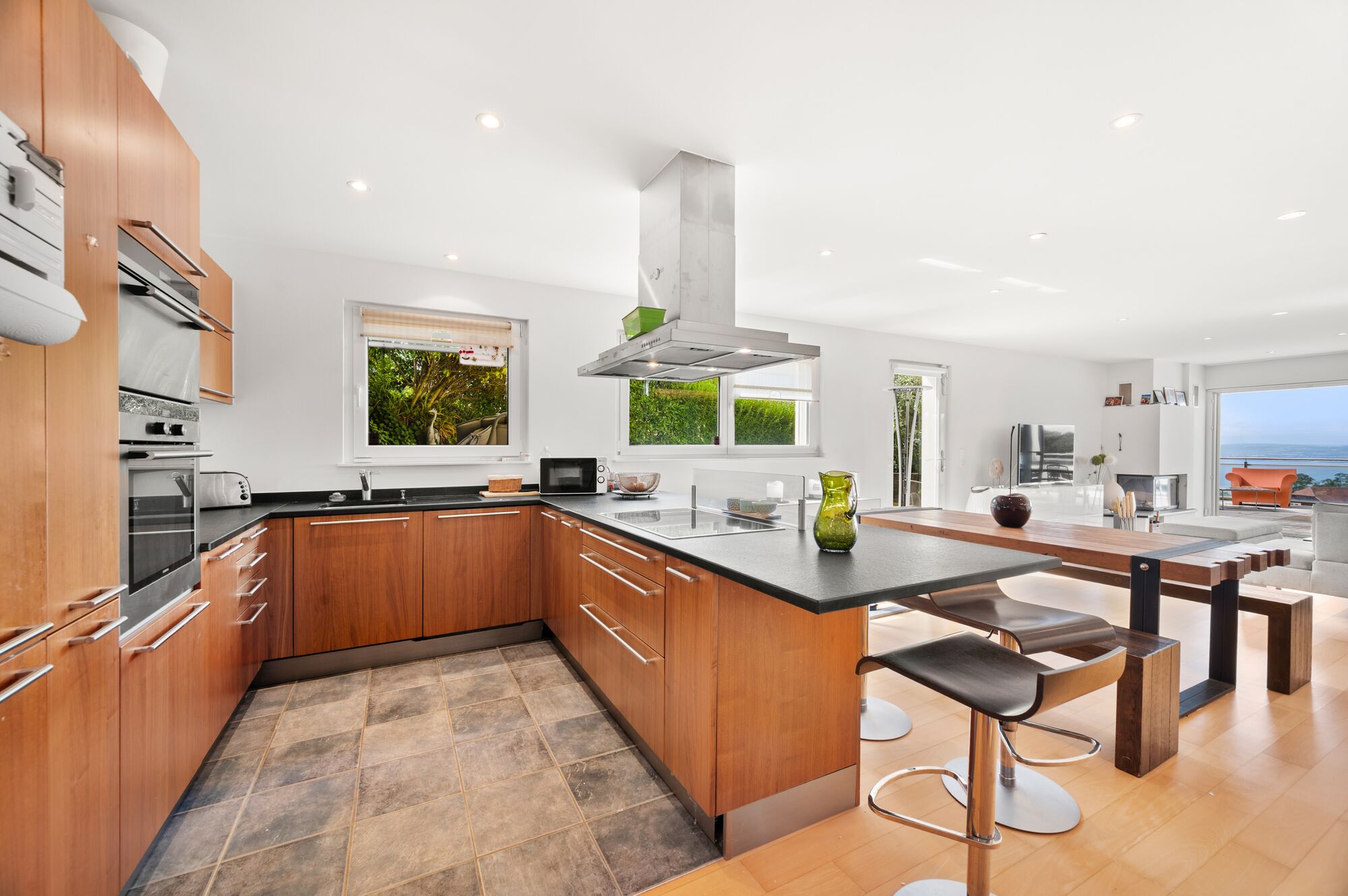 • Rez-de-chaussée : séjour avec cheminée et accès direct à une grande terrasse offrant une très belle vue sur le lac, cuisine ouverte avec accès à une deuxième terrasse/jardin intime (partie piscinable), ainsi qu’un espace buanderie avec garde-manger pouvant être utilisé comme cave à vin.