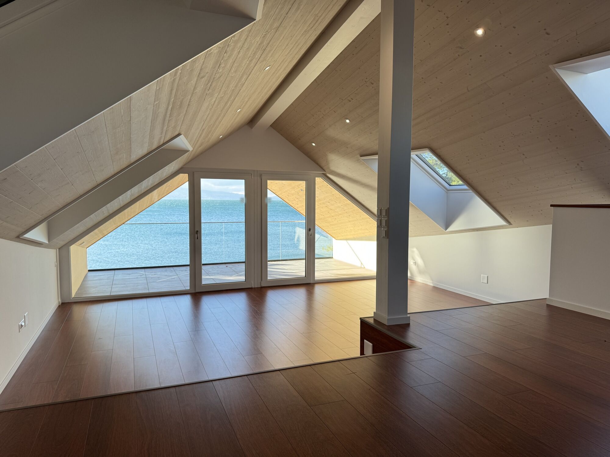 Le duplex de 5,5 pièces bénéficie d’un accès direct par ascenseur privatif. À l’intérieur, un spacieux hall mène à l’espace salon/salle à manger offrant une vue splendide sur le lac et les montagnes et permet d’accéder à la partie terrasse / jardin. La cuisine ouverte crée un espace convivial et spacieux, avec un garde-manger et un accès à l’extérieur également. Cet étage comprend également une pièce polyvalente pouvant servir de bureau ou de chambre d’amis, ainsi qu’une salle de cinéma et une salle de bain. Une buanderie et un espace de rangement sont également à disposition. À l’étage se situent trois chambres, dont deux offrant une vue splendide sur le lac et un accès au balcon. La chambre principale dispose d’un dressing et d’une salle de bain attenante. Une deuxième salle de bain est également présente à cet étage.