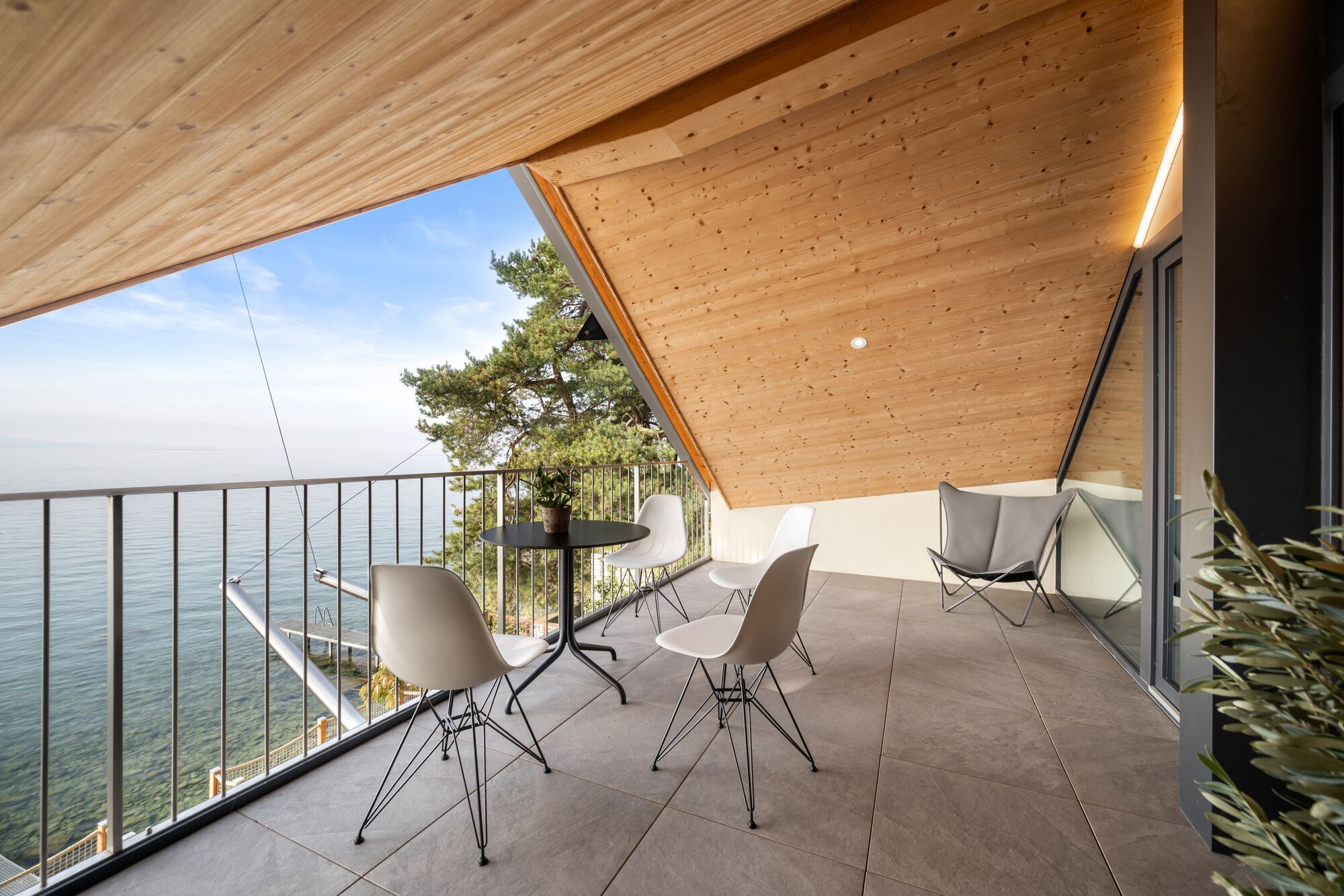 - Duplex de 3,5 pièces (env. 110 m2) : actuellement loué, il offre une pièce de vie lumineuse avec balcon face au lac, une cuisine ouverte, deux chambres avec rangements intégrés ainsi que deux salles d’eau. Le revenu locatif est de CHF 66’000.– par année, garanti jusqu’en 2029 au minimum.