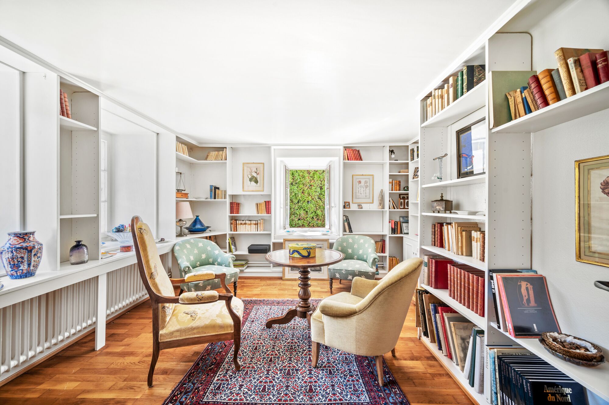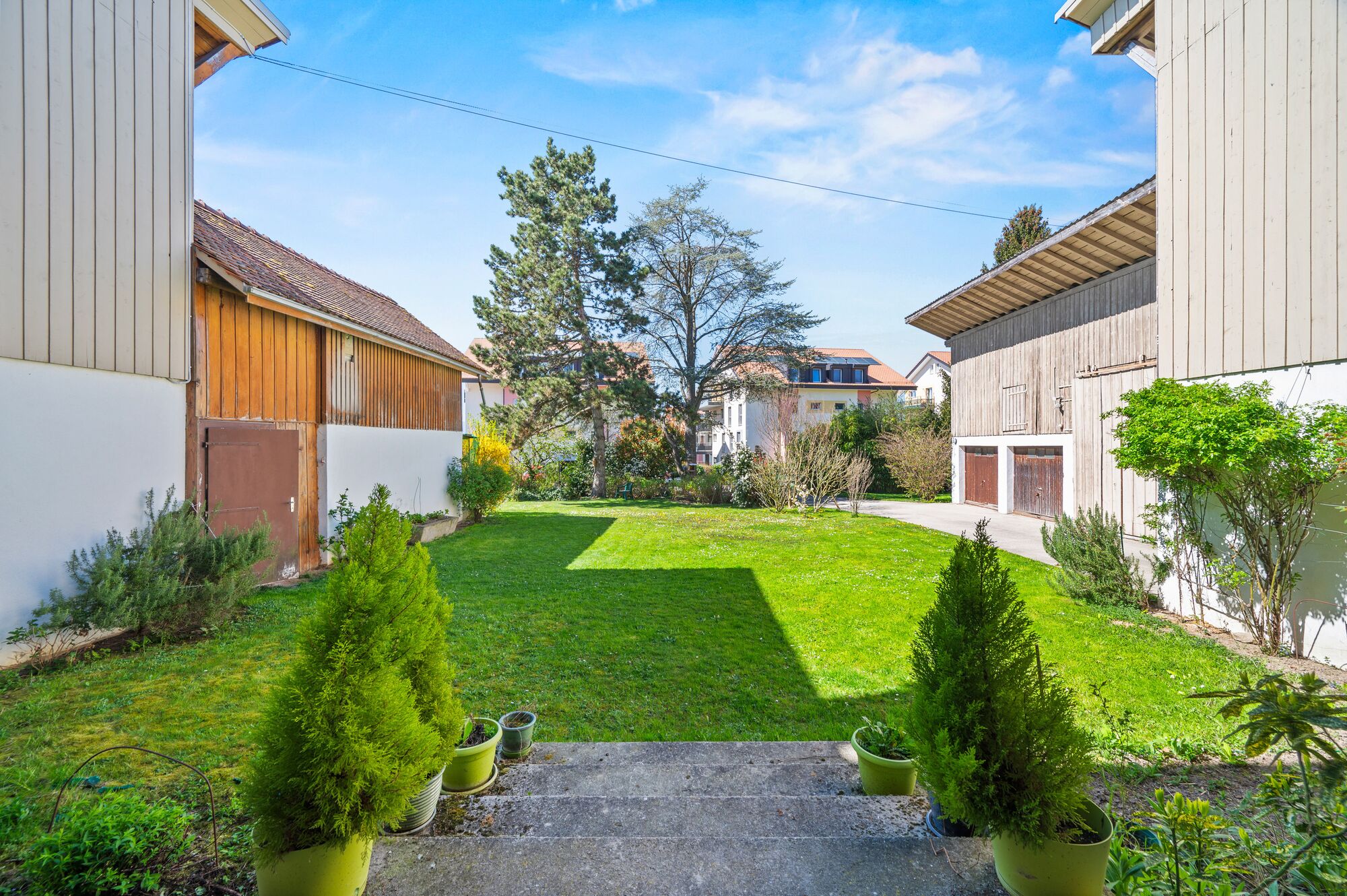 Ce cadre enchanteur garantit une parfaite intimité grâce à la présence de grands arbres et de massifs fleuris. En son centre, une pelouse offre un espace de détente idéal pour les jeux d’enfants.
