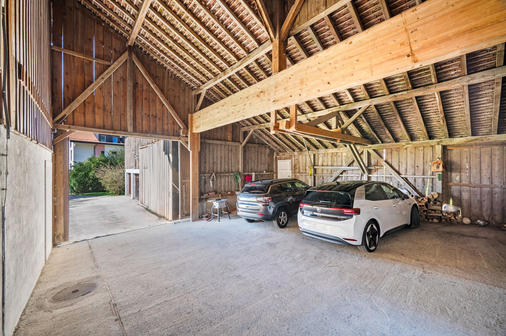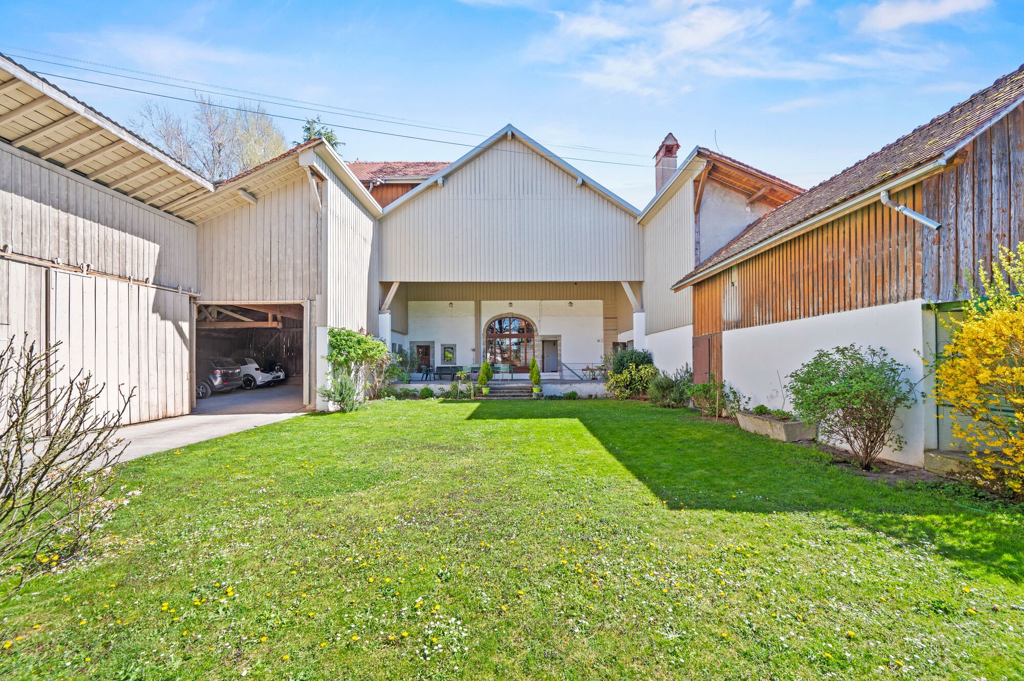 Les espaces extérieurs sont aisément accessibles de plain-pied. Une vaste terrasse couverte s’ouvre sur le jardin. D’un côté, une petite dépendance peut faire office de logement annexe ou de bureau ; de l’autre, l’ancienne grange sert aujourd’hui de dépôt et d’espace de stationnement.