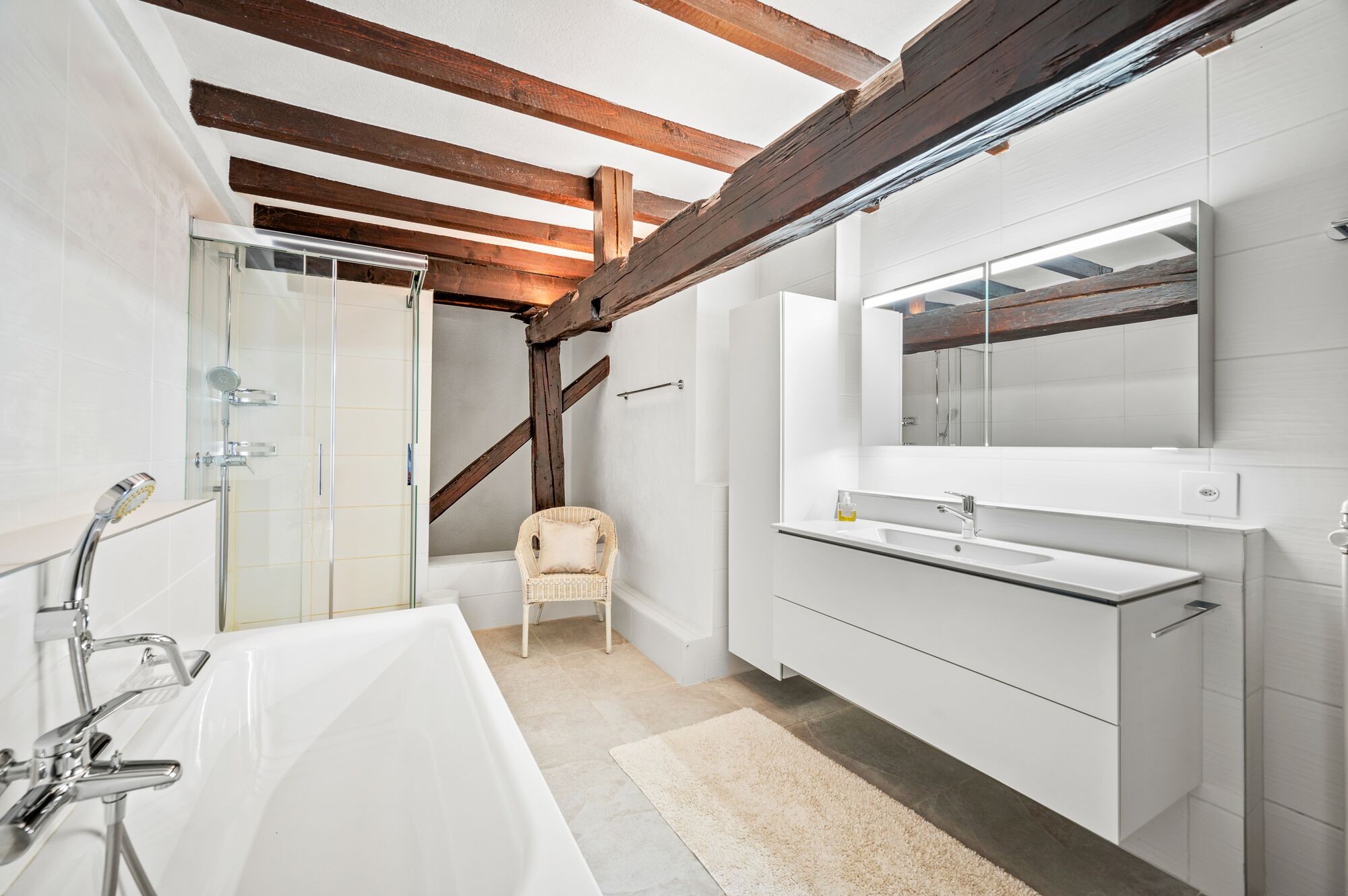 Construite au XIXe siècle, la ferme dispose désormais de six chambres et de quatre salles d’eau. À noter que la chambre principale comprend son propre salon avec cheminée, une mezzanine aménagée en coin nuit, un dressing ainsi qu’une vaste salle d’eau.