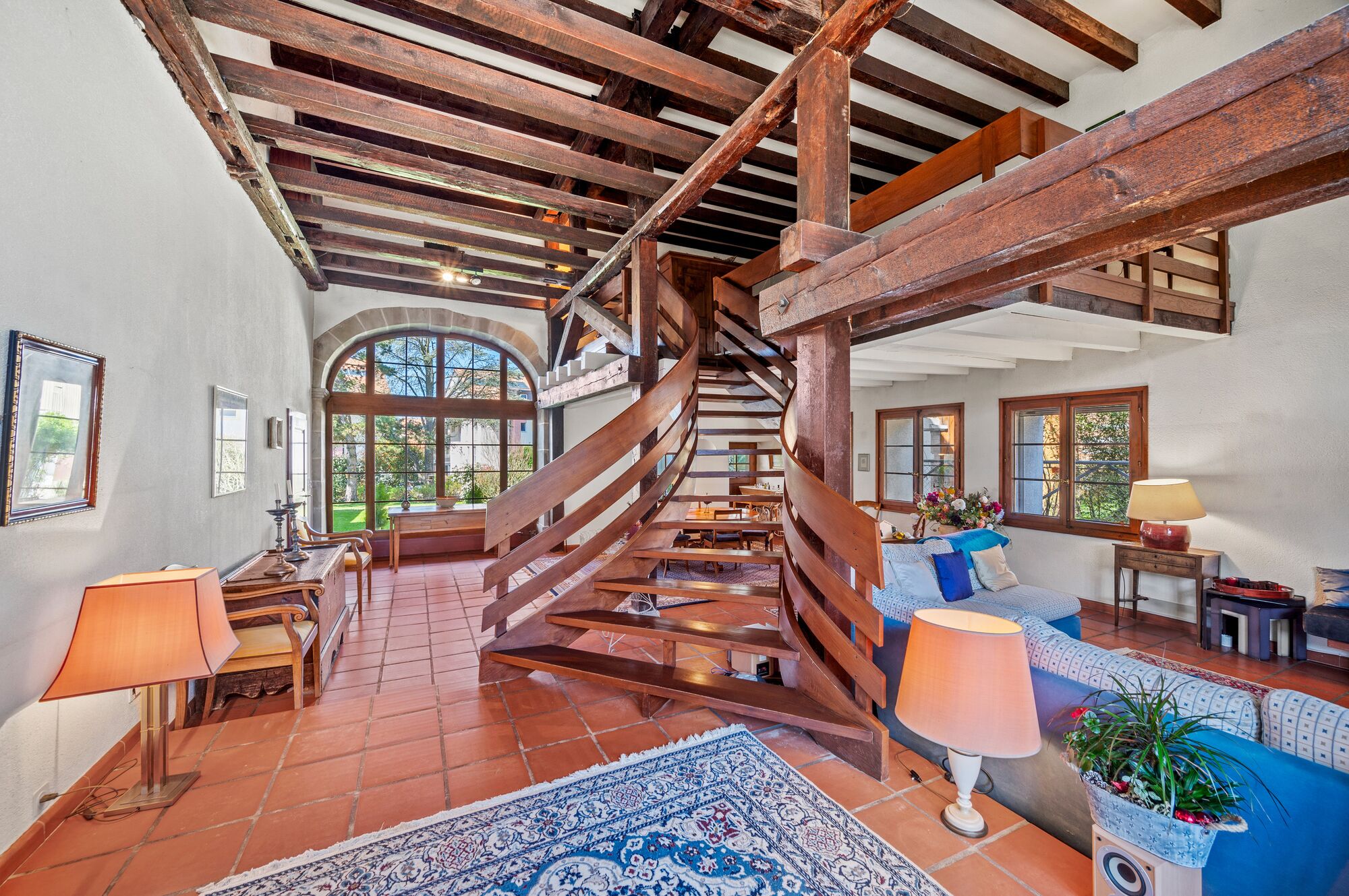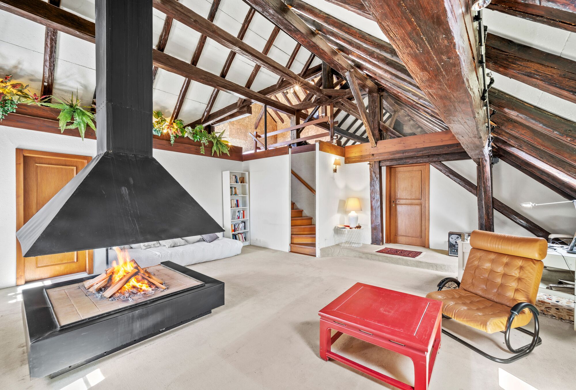 L’accès à la propriété peut se faire aussi bien par l’est que par l’ouest. D’un côté, on découvre un séjour agrémenté d’une cheminée et doté d’une double hauteur, avec une mezzanine n’en occupant qu’une partie. De l’autre se trouvent une bibliothèque ainsi qu’une cuisine. Cette dernière est équipée et aménagée de façon moderne, avec une surface et une fonctionnalité parfaitement adaptées à une grande maison.