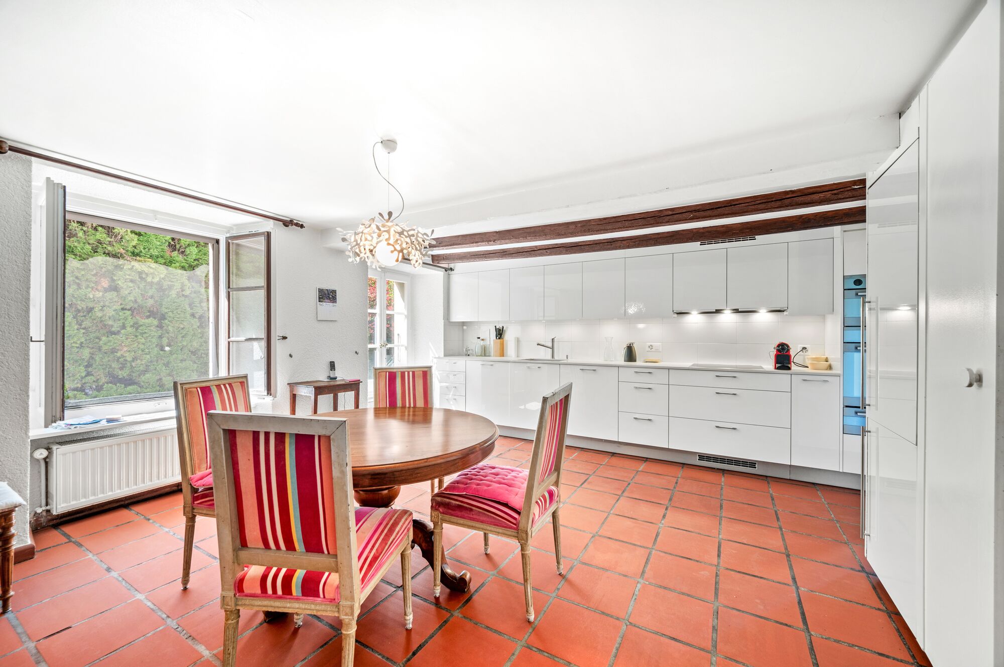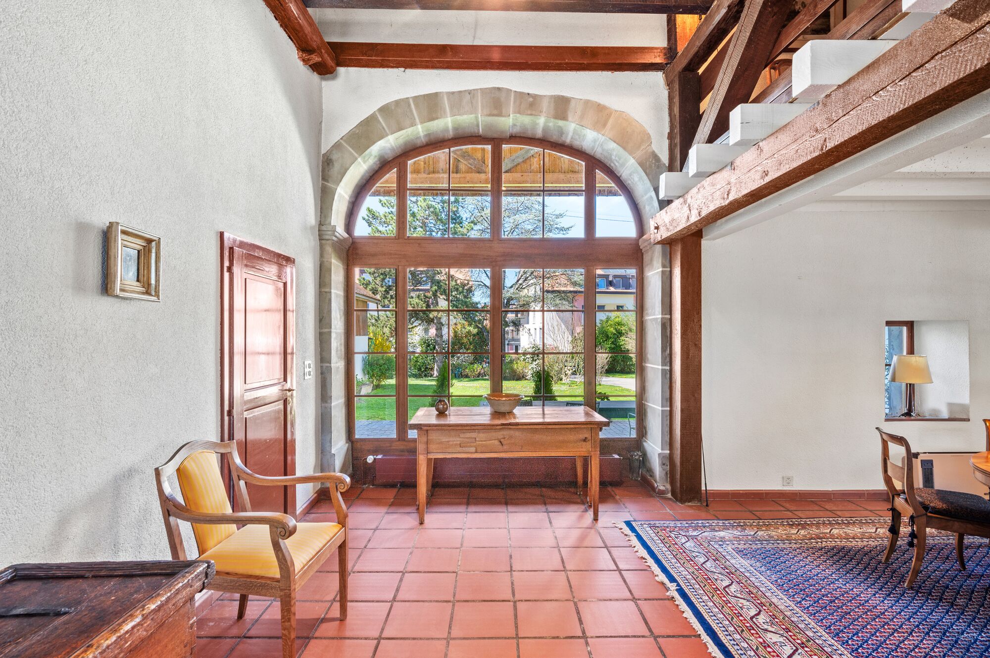 Cette ancienne ferme familiale a été transformée, dans la seconde moitié des années 1970, en une habitation de charme. Elle bénéficie d’un agencement intérieur qui privilégie les grands volumes, lui conférant ainsi un caractère résolument contemporain. Les finitions, avec notamment l’utilisation de terre cuite et de poutres apparentes, s’inscrivent dans un style campagnard authentique.