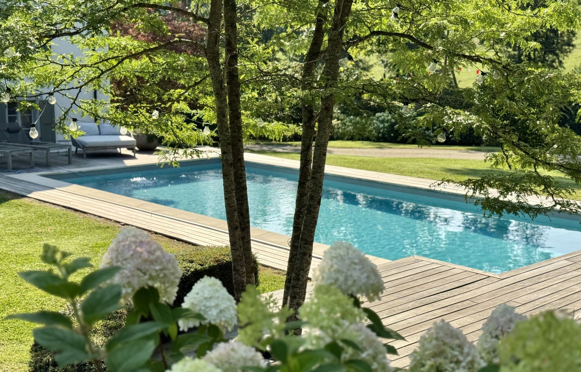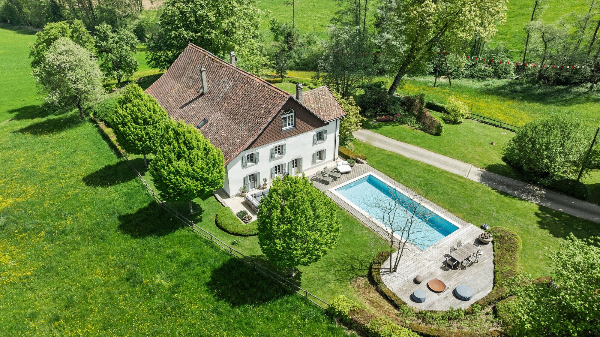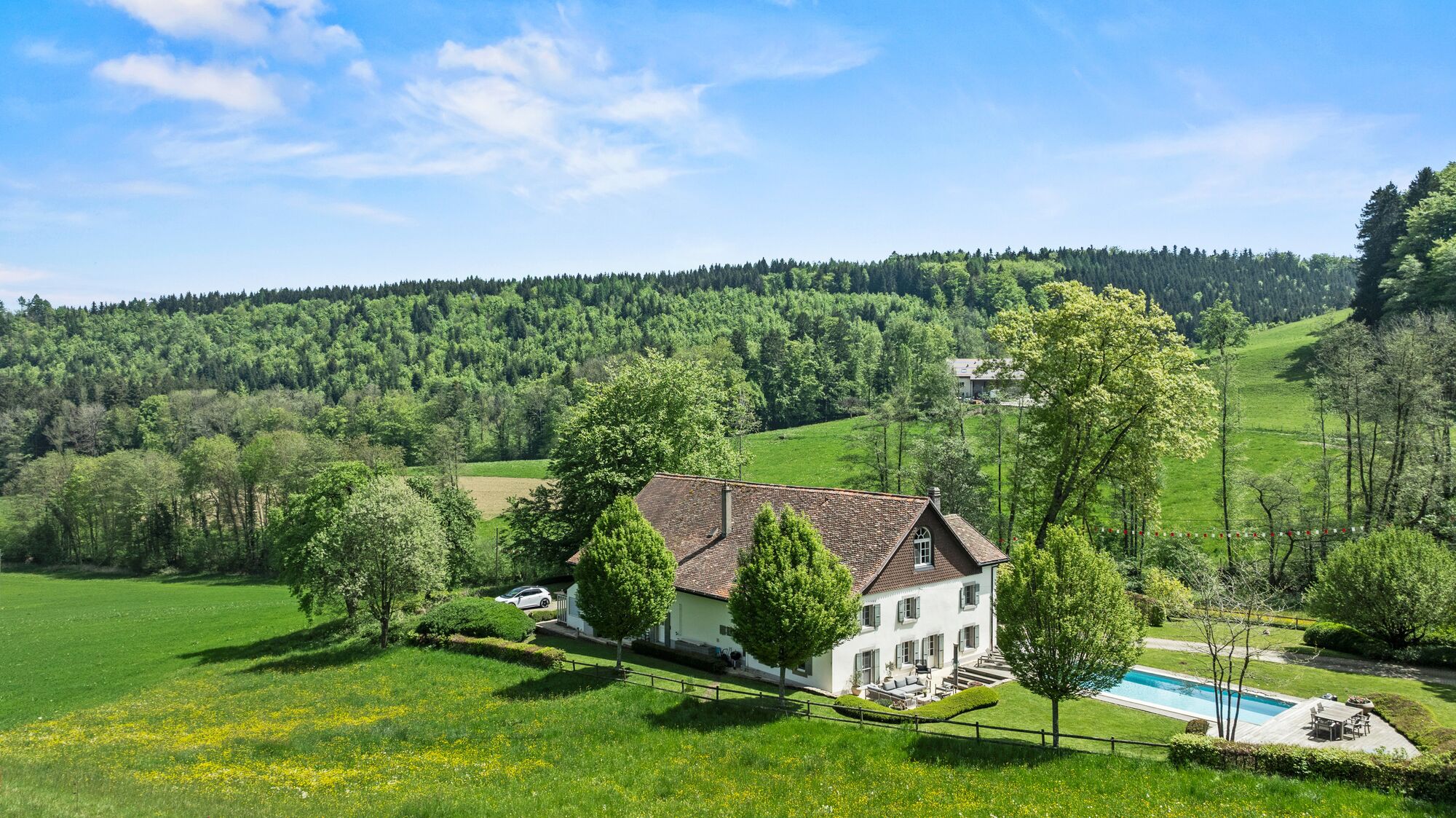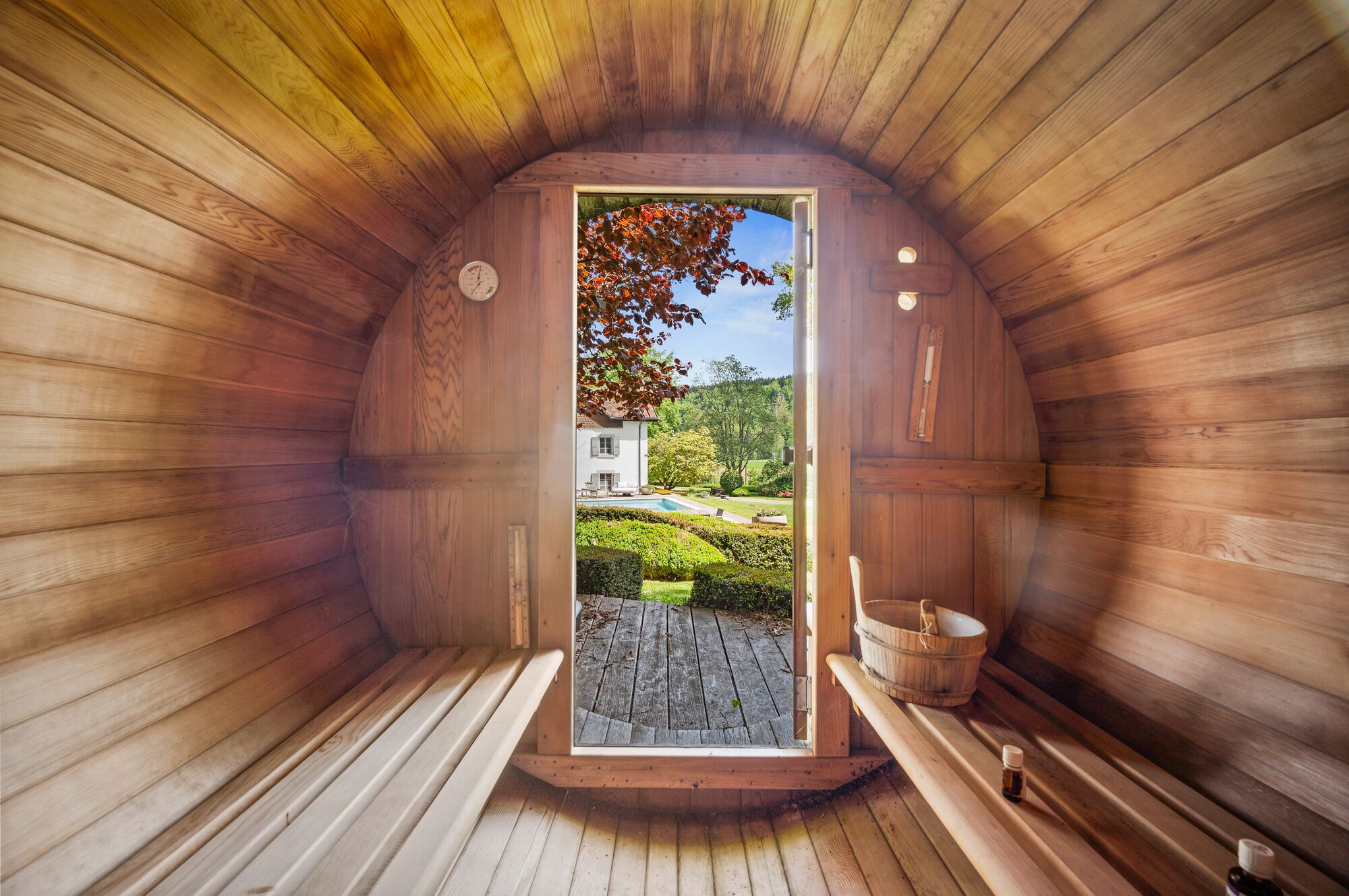 Une vaste terrasse baignée de soleil s’ouvre sur la verdure environnante, tandis qu’une piscine et un sauna viennent compléter ce bien.