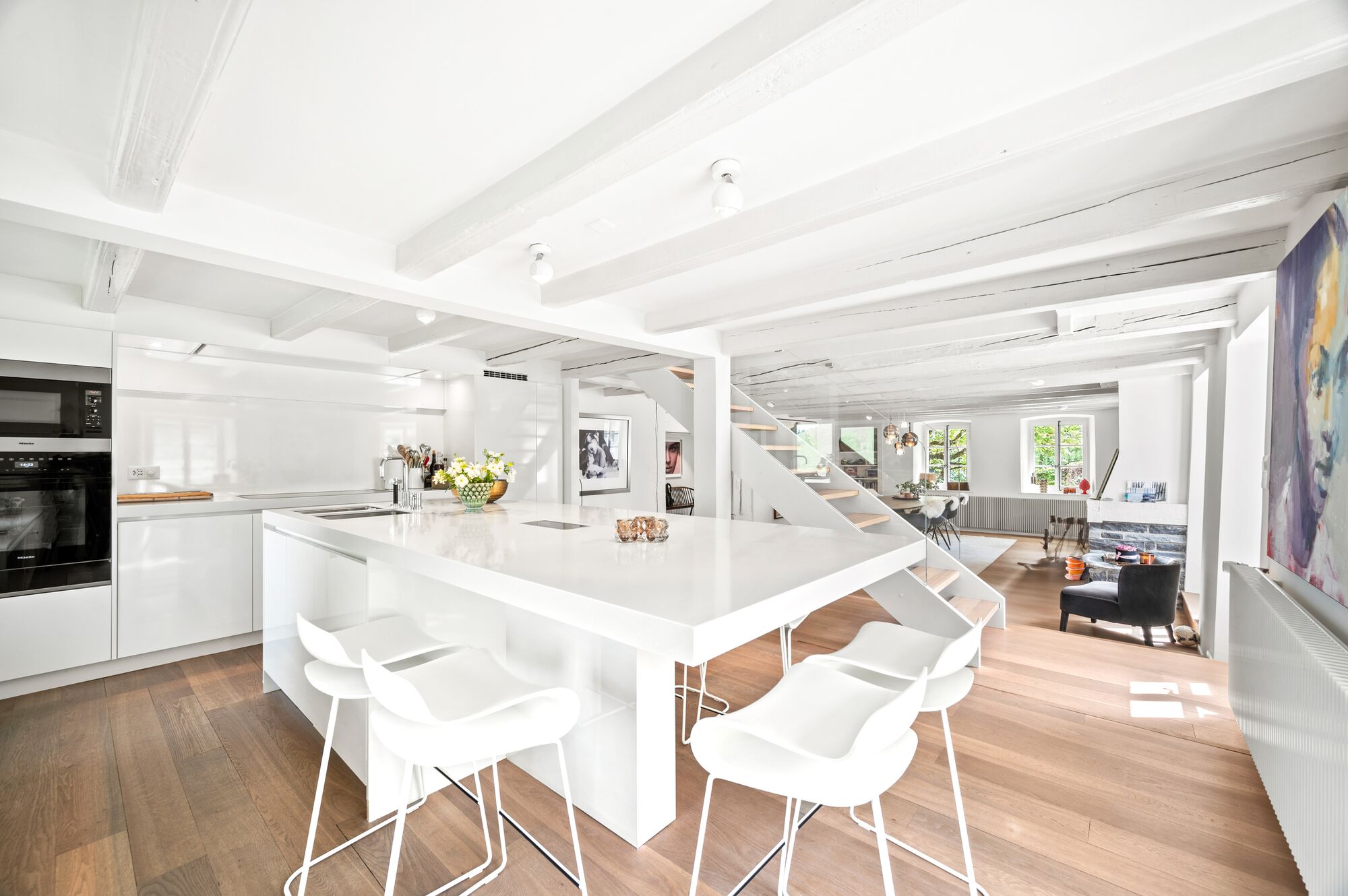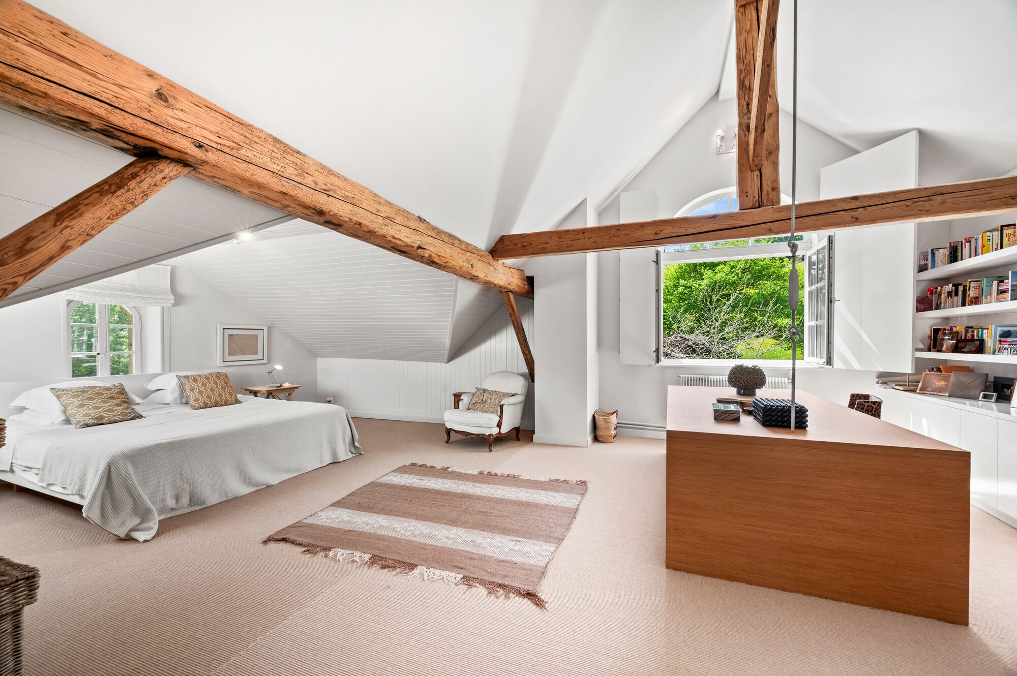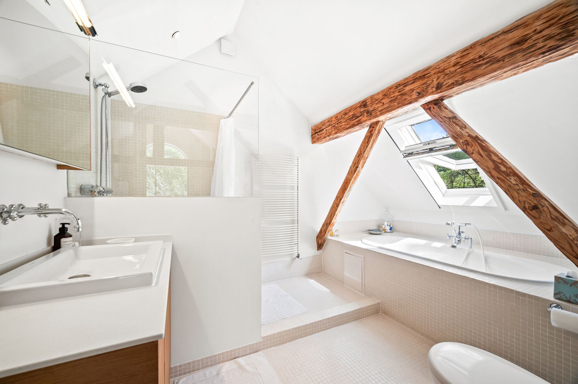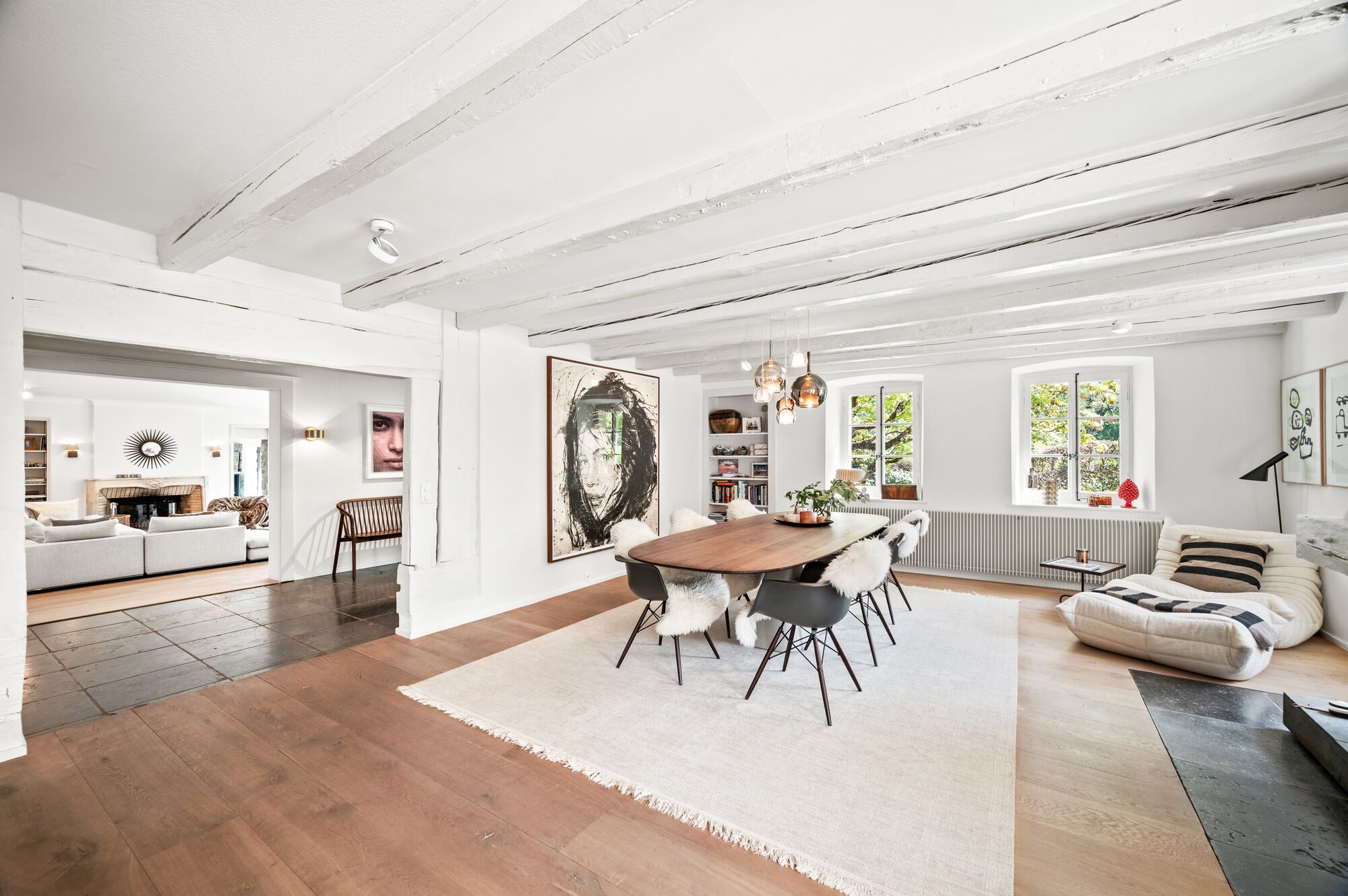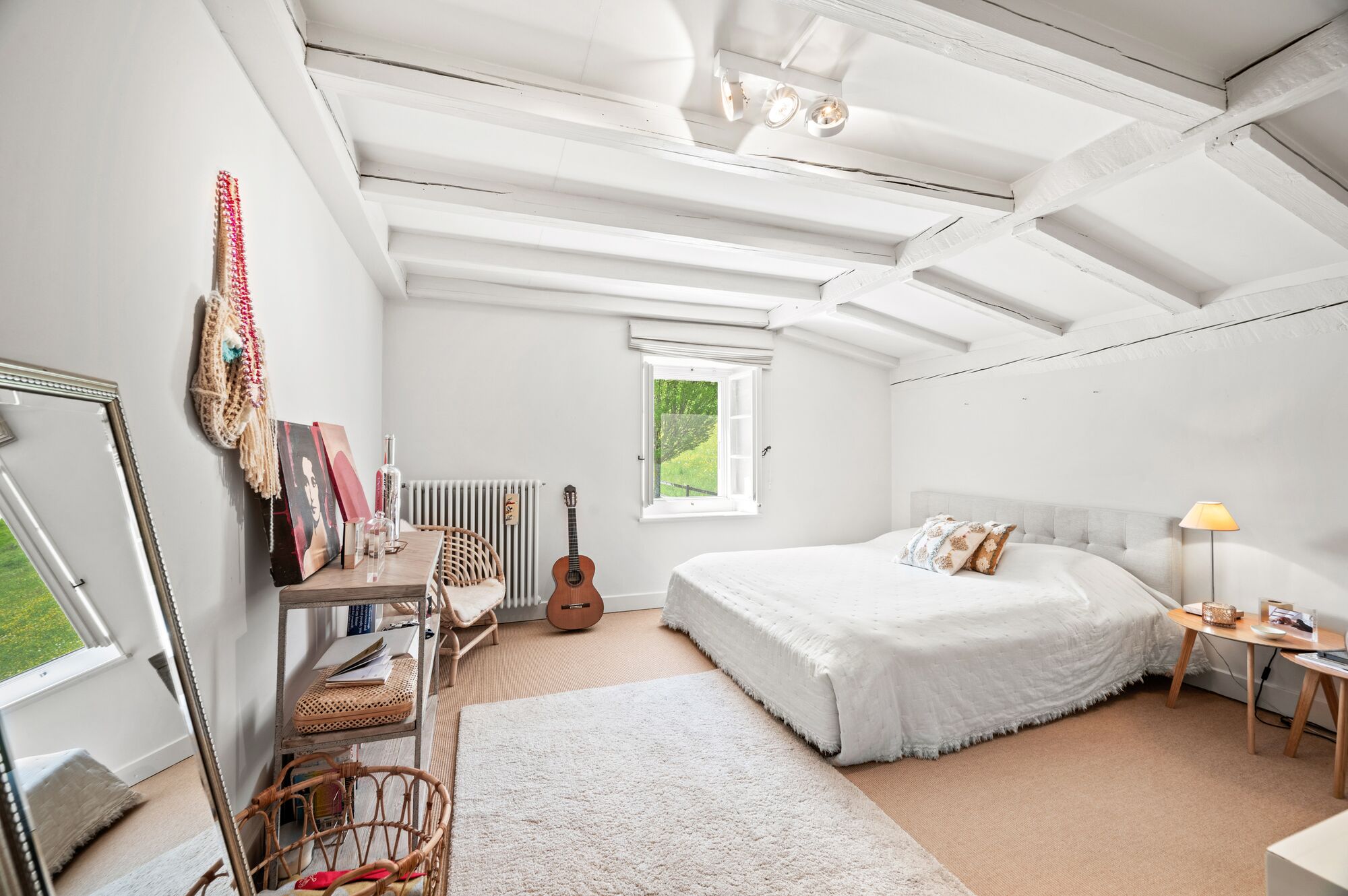 Les poutres apparentes contribuent au charme du bien, la finition dans son ensemble est contemporaine et bercée par la lumière.