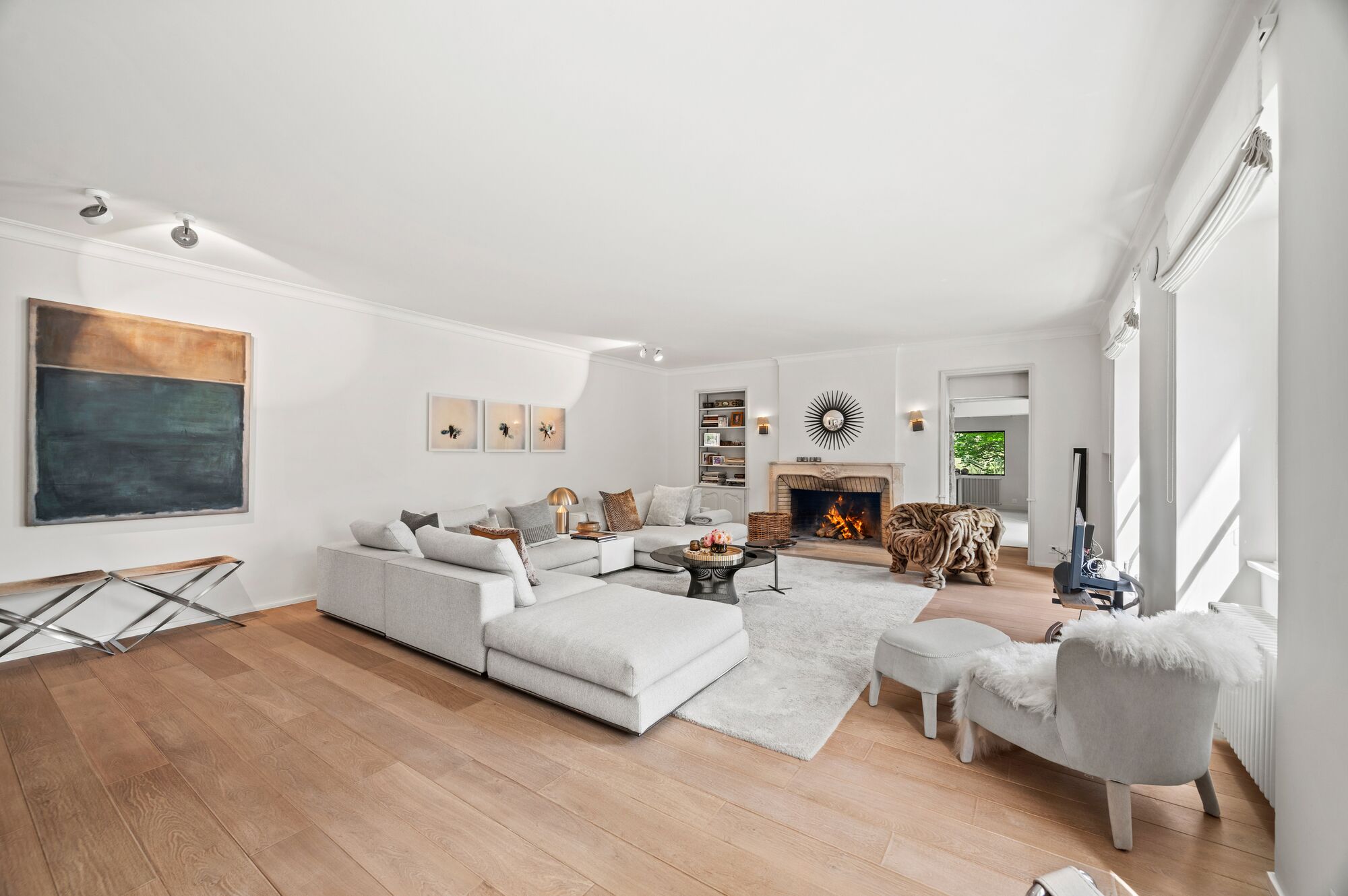 Le salon principal est également agrémenté d’une belle cheminée, il se prolonge sur un deuxième salon qui fonctionne comme un familly-room/bureau.