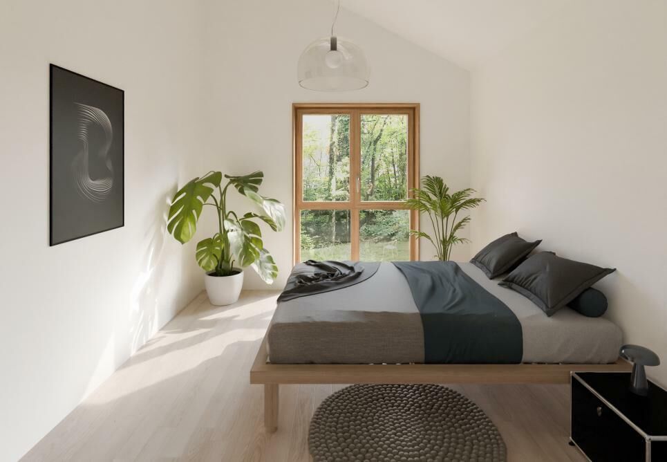 On accède ensuite au rez jardin par un bel escalier au niveau des chambres. Celui-ci est composé de 3 chambres à coucher (avec possibilité de rajouter une 4ème chambre) ainsi que de 2 salles d’eau. Afin d’optimiser l’espace et de profiter du très grand volume des chambres, des options de mezzanines sont également possibles à la demande des acheteurs.