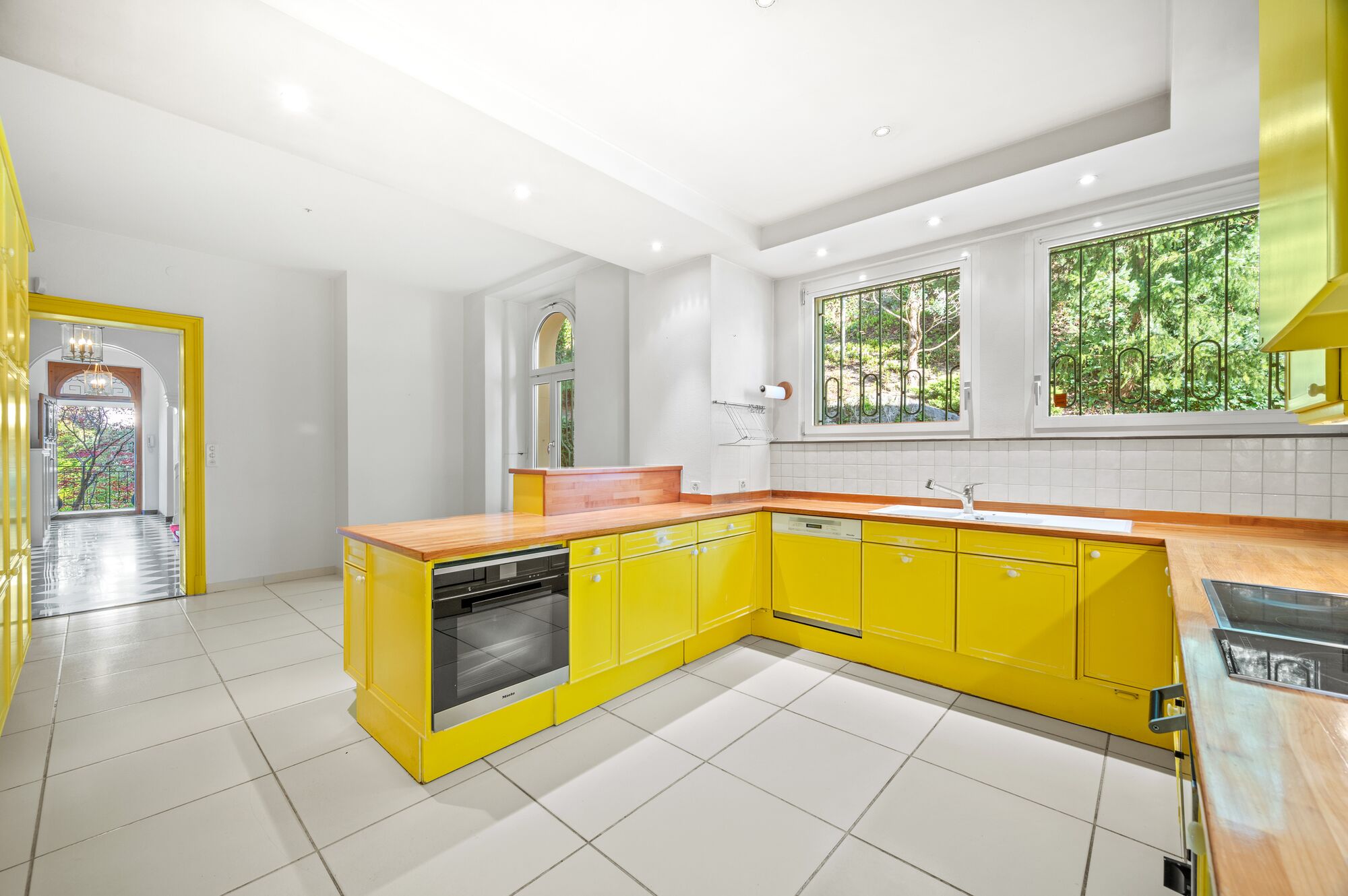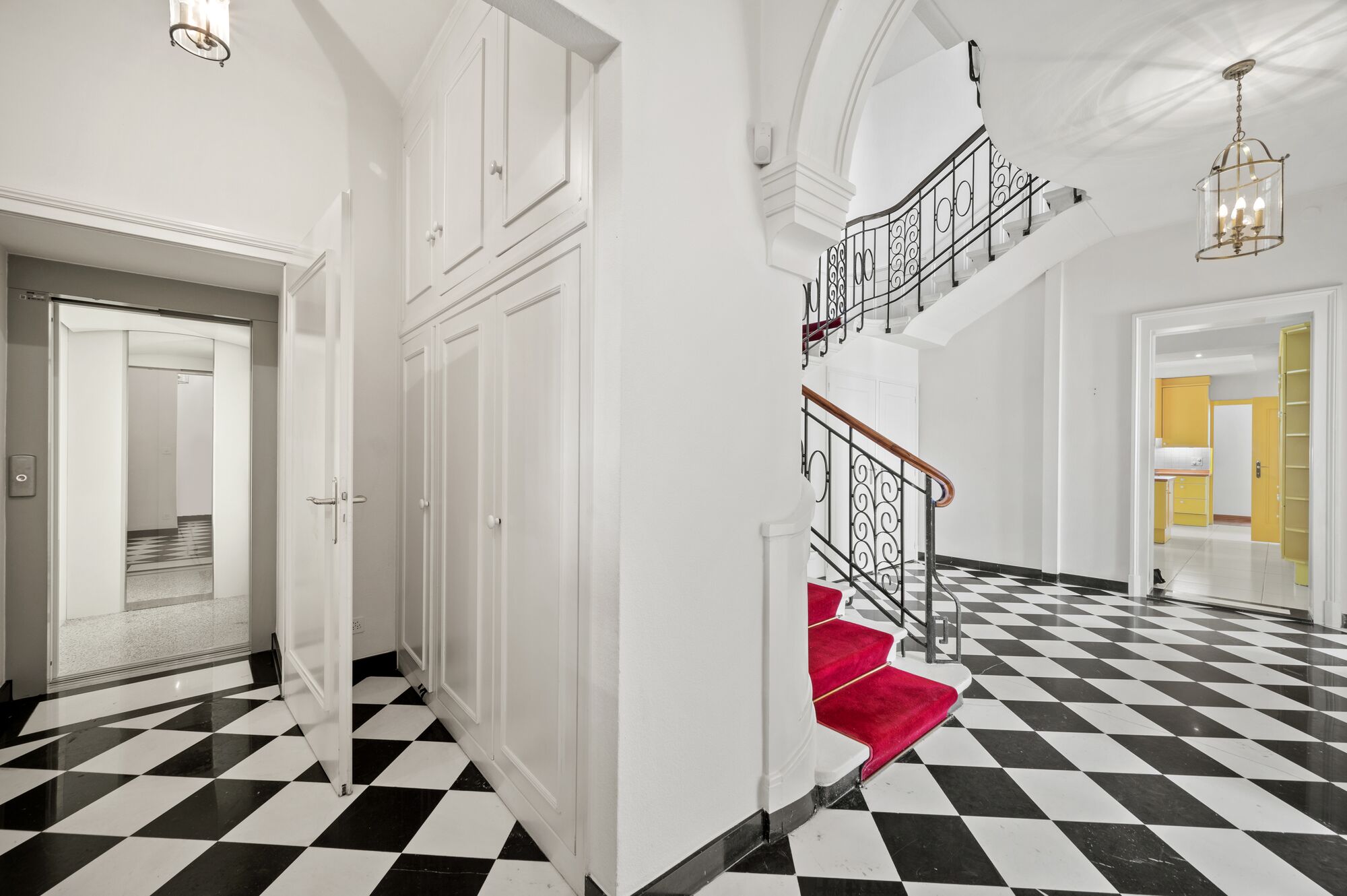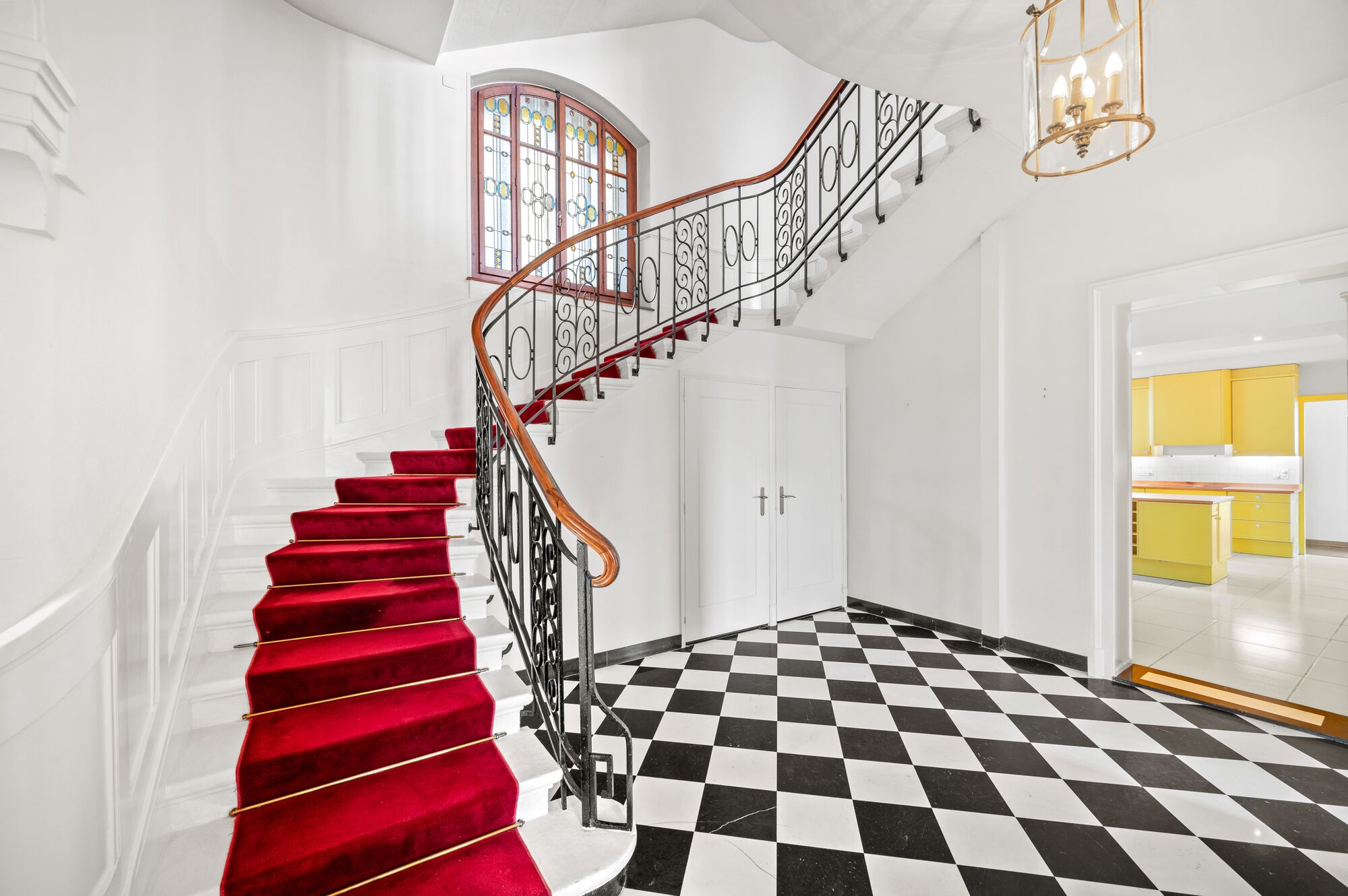 L’espace de réception est principalement concentré au niveau du rez-de-jardin. Il comprend un hall d’entrée avec vestiaire et toilettes invités, un hall de distribution avec un escalier de caractère, trois pièces de réception en enfilade, une cuisine avec un espace à manger d’environ 40 m², ainsi qu’une suite avec une entrée indépendante.