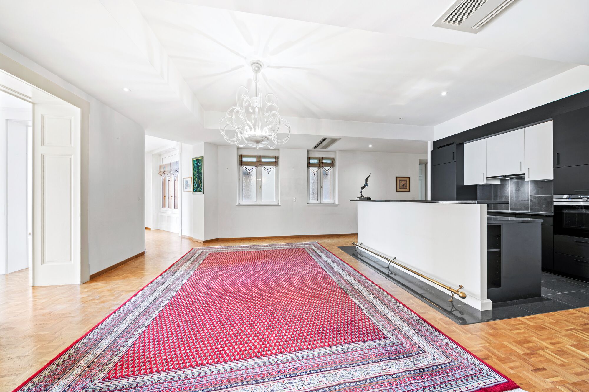 L’appartement propose une disposition unique, comprenant un vaste espace de vie qui regroupe une cuisine ouverte, une salle à manger et un salon en deux parties. Les volumes généreux et la hauteur sous plafond remarquable apportent une véritable sensation d’espace et de confort. Le salon offre une vue dégagée sur le lac Léman et les montagnes. Le bien dispose de trois chambres à coucher, chacune dotée de sa propre salle de bain privative.