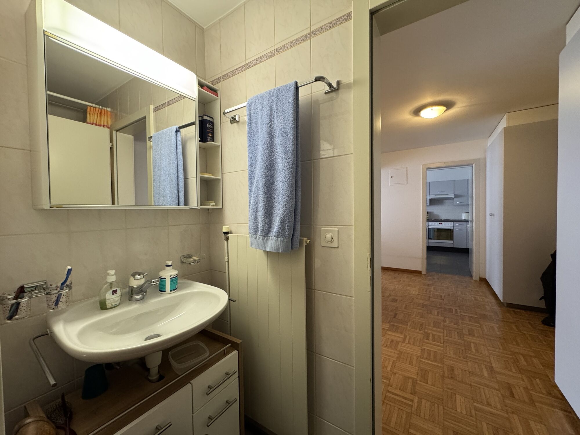 This functional 2.5-room apartment is located on the first floor of a 12-unit condominium. It offers around 62 m² of living space, including a bedroom, as well as a kitchen opening onto the dining room and living room. A south-facing balcony and a bathroom with bathtub complete the ensemble.