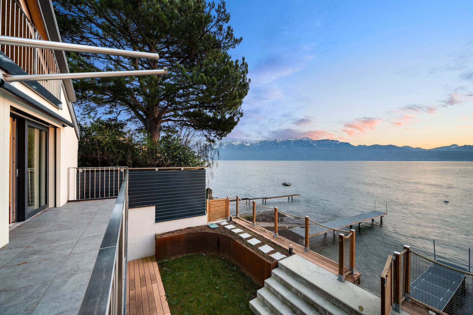 It features a vast living room open onto the terrace and garden offering direct access to Lake Geneva, a kitchen with pantry, a multi-purpose room, a cinema room, three bedrooms on the first floor – two with balcony and lake view – as well as two bathrooms, a laundry room and generous storage space.