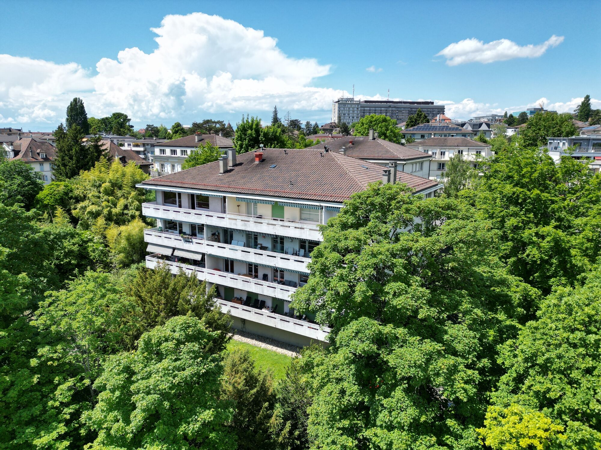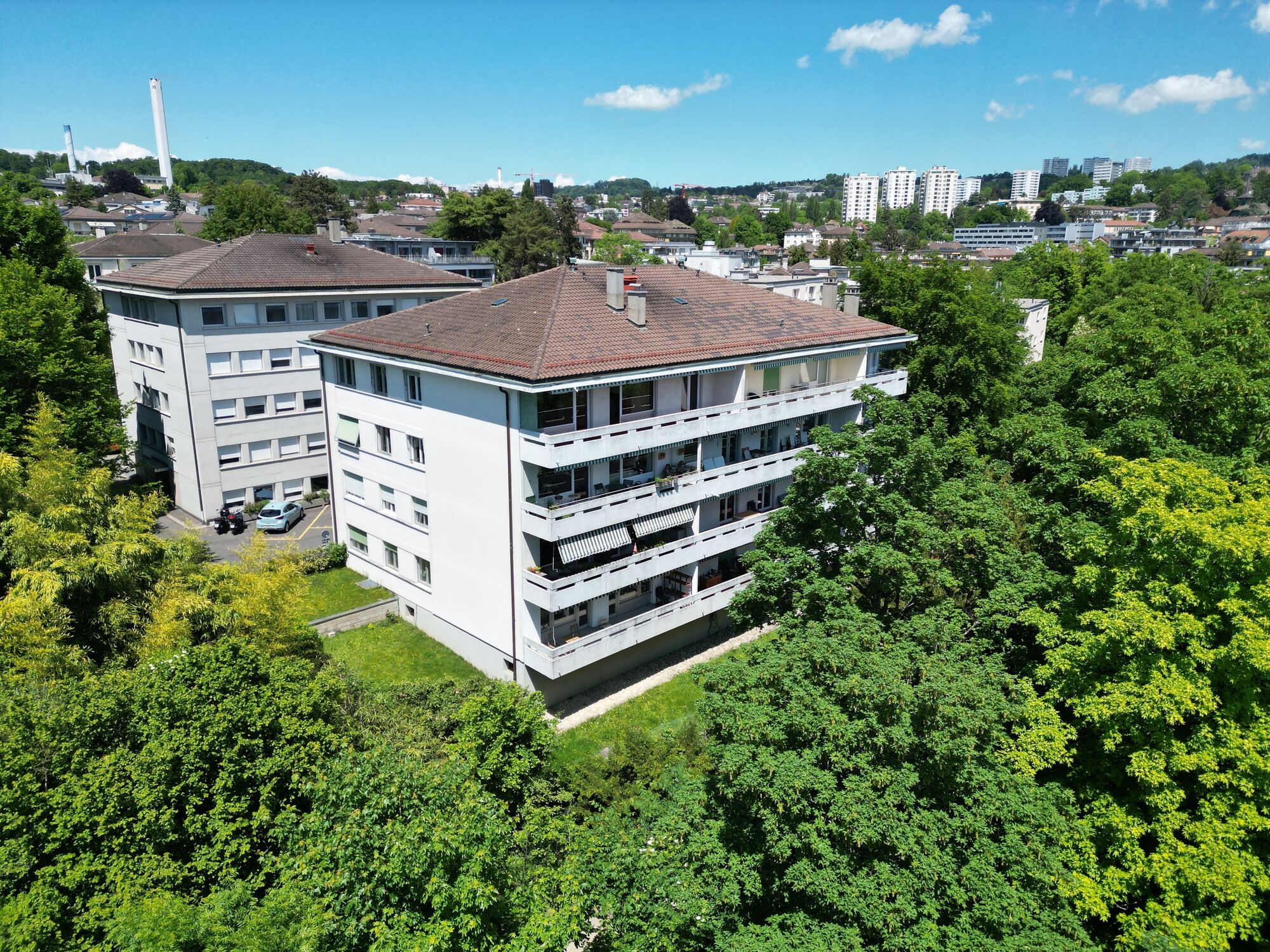 The building is located in the immediate vicinity of the Pont de Chailly, Lausanne and has direct access to public transport, shops and schools. The metro is a 6′ walk away. The living environment is pleasant, with unobstructed views of the Parc de la Gottetaz, the lake and the Alps in a quiet, wooded setting.
